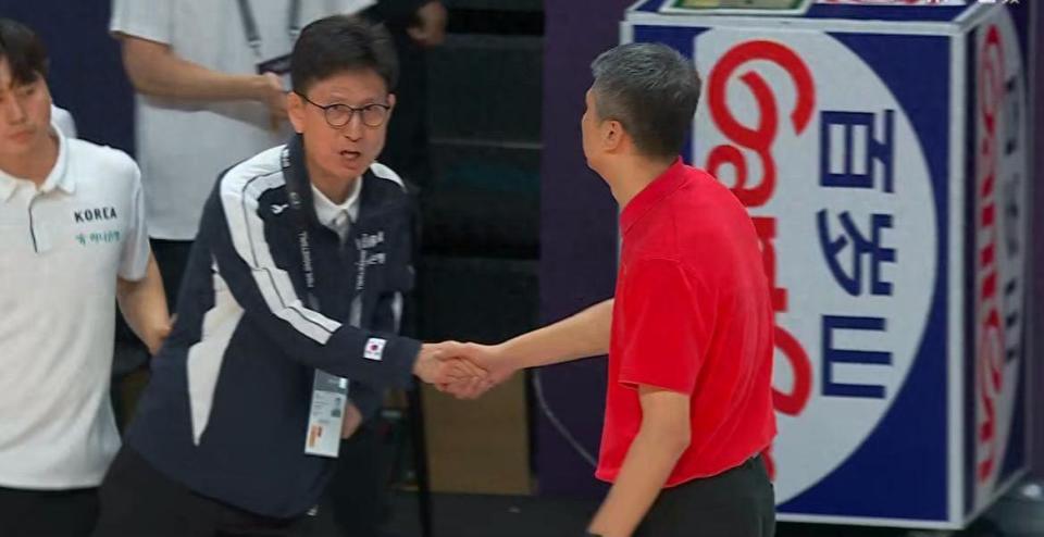 比赛结束时安俊浩并不是第一时间与郭士强握手,而是他们的助理教练。比赛最后一攻中国队放弃了进攻,这20秒钟像20分钟那样长,被戏耍的安俊浩肯定心里不好受,所以迟迟才与郭士强握手。
