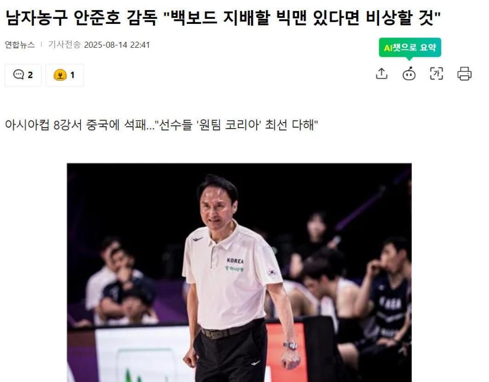 韩国男篮主教练安俊浩颇有意思,赛前信心满满,牛气冲天,称1/4决赛定会越过中国长城。可输了比赛后,他又不服气。