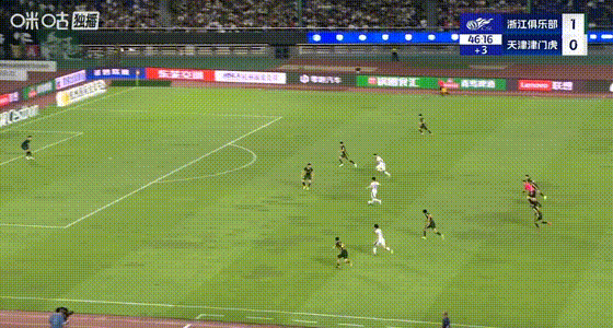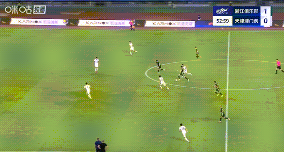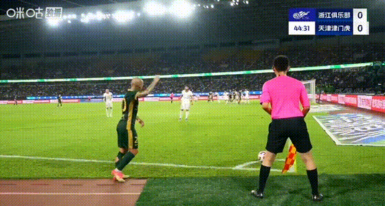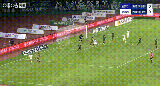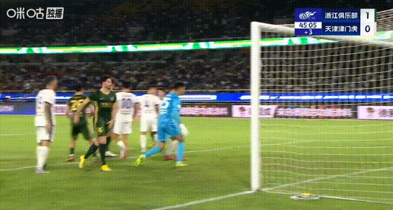 第45分钟,米特里策角球开到后点,卡列洛头球攻门顶进,浙江队主场1-0领先。